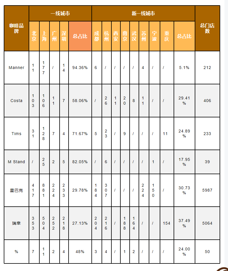 1、主流咖啡品牌在各城市的门店统计