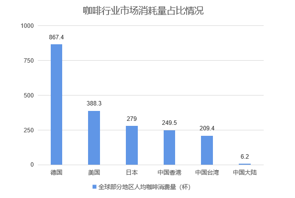 2018年我国大陆地区咖啡人均消费量为6.2杯,仅为德国的0.71%,美国的1.6%。全球咖啡市场规模超过12万亿,而我国目前只有约700亿,与人口比例差距较大。