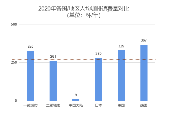 2020年我国大陆人均咖啡消费量在9杯/年,而日本在280杯/年,美国329杯/年,韩国367杯/年,大陆人均消费量远低于主要国家人均咖啡消费量平均值。