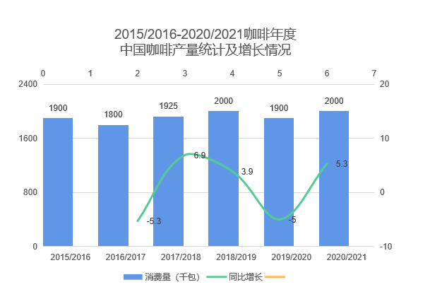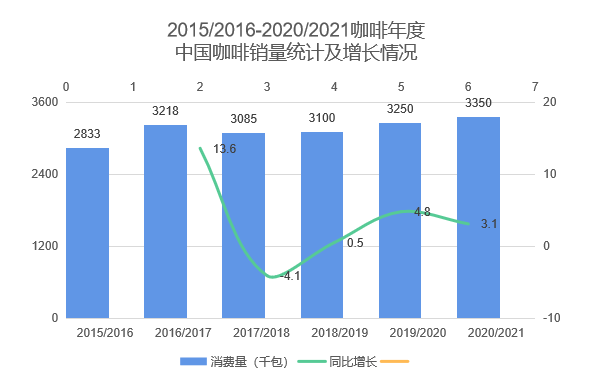 据美国农业部(USDA)统计,2019/2020咖啡年度中国咖啡消费量为3250千包,19.50万吨,同比增加4.8%。预计2020/2021消费量3350千包,同比增加3.1%。
