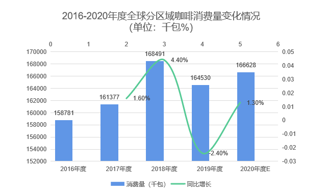 根据ICO数据,2019咖啡年度(当年的10月1日至次年的9月30日)全球咖啡消费总量约为1.6亿包,同比下降2.4%。