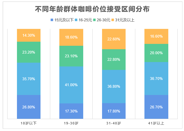 从年龄分层来看,18岁以下和41岁以上的消费者对于咖啡的价格敏感度相对较高。而19-40岁的消费者对于咖啡的接受程度与总体趋势相近,相差不明显。