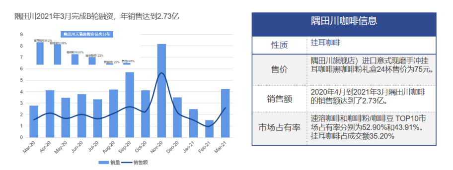 在2020年8月份完成了A轮融资,2021年3月完成了B轮融资,集资近3亿。2020年4月到2021年3月隅田川咖啡的销售额达到了2.73亿,3月份的销售额同比上升了66.57%。