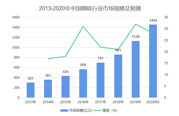 据伦敦国际咖啡组织数据显示,与全球平均2%的增速相比中国的咖啡消费正在以每年15%的惊人速度增长。2020年中国咖啡市场规模突破3000亿元,预计2025年可以达到1万亿元。