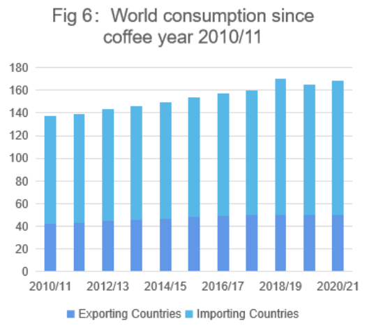 2020/21年度全球咖啡消费预计增长1.9%至1.6758亿袋,自2010/11n年度以来,全球咖啡消费年均增长率达到1.7%。2020/21年度咖啡进口国消费预计增长2.3%至1.1709亿袋,出口国消费预计增长1%至5050万袋。