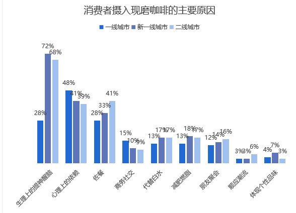 从城市分布来看,一线城市的消费者78%摄入现磨咖啡的主要原因是因为生理上的提神醒脑,48%是源于心理上的依赖;而二线城市有41%的消费者摄入咖啡是为了佐餐。