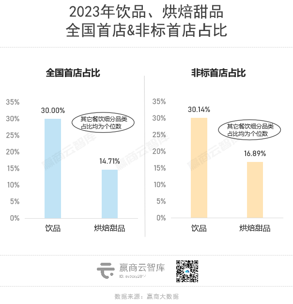 在规模之外,饮品、烘焙甜品新入局者众多、创意迭出。近四年两者全国首店、非标首店占比持续位列前三,占比近50%,远超其它餐饮品类。
