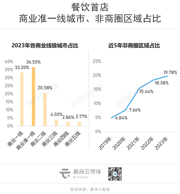 据赢商大数据监测,2019-2023年,商业准一城市、非商圈区域的餐饮首店占比不断上升。商业高线级城市与商业低线级城市商业增量差距逐步缩小、商业区域“空白”被不断开发,为餐饮首店选址提供了更多选择。
