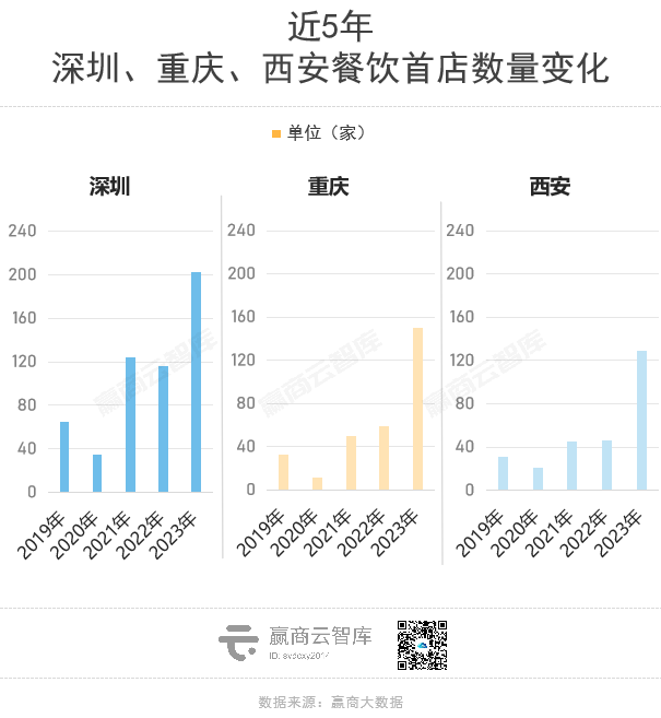 其中,2023年深圳、重庆、西安餐饮首店绝对数均大幅飙升,前二者力压上海分列TOP1、TOP2,西安则是重回TOP10城市。三者依次引入超200家、150家左右、超120家餐饮首店,相比2019年分别暴涨210.77%、354.55%、134.24%。