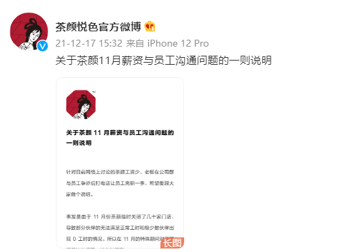 据了解,日前茶颜悦色公司内部群聊记录被曝光,其内容显示,部分长沙员工因疫情减工时、降薪,到手工资由原本的5000元左右降低至2000元左右,提成仅8元,因而在茶颜悦色内部群聊中引发讨论。有员工称,工资太少、房租吃饭外所剩无几;也有人对高强度的工作规划不满。有员工因群内的争执,接到吕良的电话。电话中,吕良表示,“那明天你来找我提离职吧,我亲自签。”而后,吕良也在公司内部群透露,工资虽少但公司是按劳发放,茶颜悦色在疫情期间一个月亏损2000多万元。