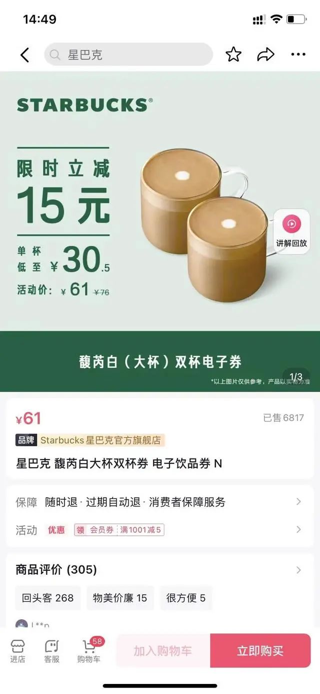 记者前往星巴克抖音官方账号查看,发现“馥芮白双杯兑换券”价格已更改为61元,0.01元券的兑换链接“不知所踪”。
