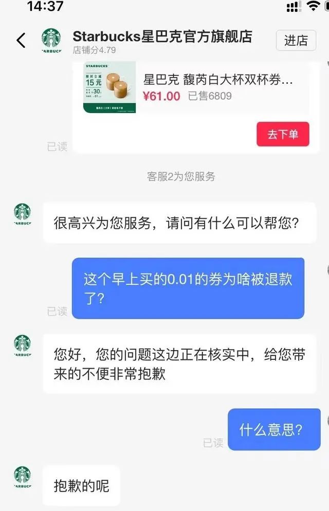 针对此事,记者与抖音平台星巴克官方客服取得联系,对方表示,目前正在核实中,具体的内容还需要与第三方确认。抖音方客服给出的解释是:“目前技术已经在紧急处理,即便是退款也不要担心,后续会进行统一处理。”至于是怎么处理,并未给出确切答案。