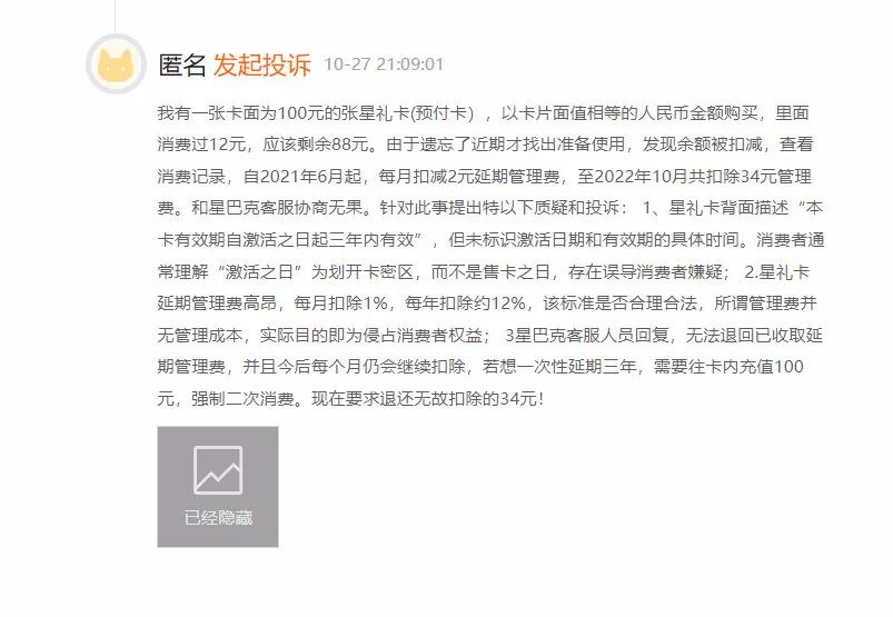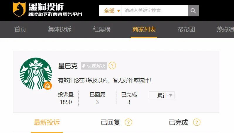 值得注意的是,在黑猫投诉平台上,星巴克投诉量累计达1850条,几乎没有处理。平台投诉多涉及星巴克食品安全问题,星礼卡超期扣管理费等。