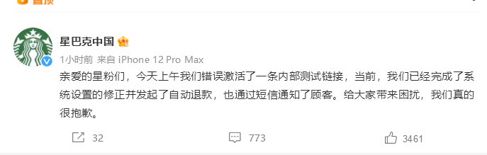 针对此事,星巴克中国23日下午发布声明称,今天上午错误激活了一条内部测试链接,当前已经完成了系统设置的修正并发起了自动退款,也通过短信通知了消费者,并进行致歉。